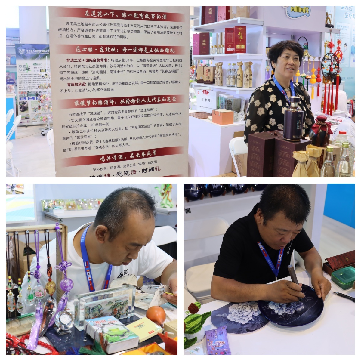 吉林残联展位使用国际标准展位45个,共405平方米,集中呈现丰富多彩的文创产品、精湛的非物质文化遗产项目、前沿的科技助残设备以及优质的吉林特色农产品。盲人智能眼镜、纯粮美酒、手工编织、内胆画、瓷器雕刻等精彩亮相,充分展现残疾人卓越技艺和创新活力,吸引众多游客驻足欣赏。
